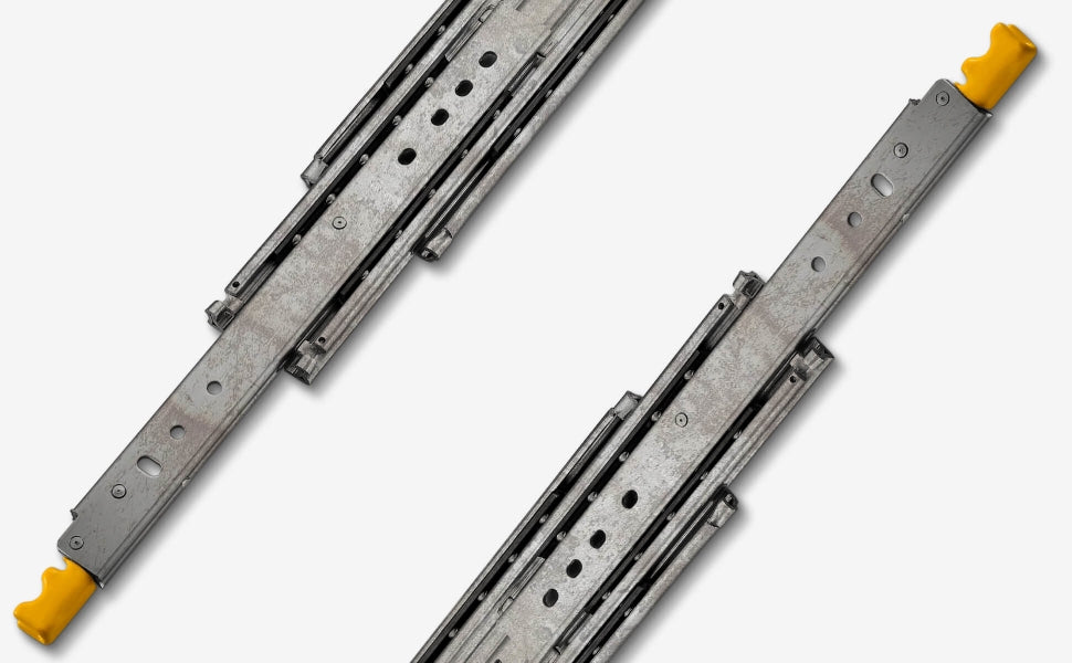 - 【Verriegelung der robusten Schubladenführungen】 Schwenken Sie die gelben Griffe zum Ver- und Entriegeln. Sie können sowohl im geschlossenen als auch im vollständig geöffneten Zustand verriegelt werden. Verhindern Sie ein Verrutschen.
